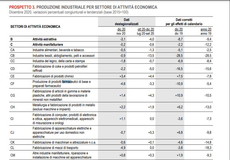 Corretto per gli effetti di calendario, a dicembre 2020 l’indice complessivo diminuisce in termini tendenziali del 2,0% (i giorni lavorativi di calendario sono stati 21, contro i 20 di dicembre 2019). Si registra un incremento tendenziale solo per i beni intermedi (+4,1%), mentre i restanti comparti mostrano flessioni, con un calo pronunciato per i beni di consumo (-9,8%) e meno marcato per gli altri aggregati (-2,1% per i beni strumentali e -0,7% per l’energia).
