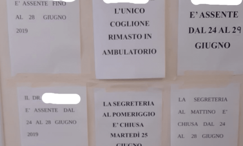 Un collega ci invia questi cartelli [sopra] visti in un ambulatorio. Per ovvi motivi abbiamo cancellato i nominativi dei medici