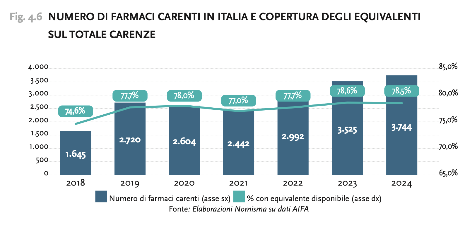 - Carenze di farmaci: negli ultimi cinque anni la carenza di farmaci è diventata un problema sempre più pressante a livello globale: l’Italia è tra i Paesi maggiormente colpiti. Secondo i dati AIFA nel periodo 2018-2024 il numero di farmaci a rischio carenza è più che raddoppiato, passando da poco più di 1.600 a oltre 3.700. Quasi la metà (44%) delle carenze registrate nel 2024 è dovuta alla cessazione definitiva della commercializzazione, mentre poco più di un quarto è legata a problemi di produzione. Per quasi otto farmaci a rischio su dieci esiste un corrispettivo equivalente: un dato che conferma l’impensabilità di un sistema farmaceutico privo dei medicinali equivalenti.