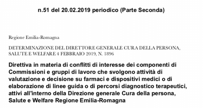 - di disporre che, terminato il periodo di osservazione di cui al punto precedente, l’applicazione della Direttiva di cui al punto 1 viene estesa ai componenti degli ulteriori gruppi di lavoro/commissioni che svolgono attività di valutazione e decisione su farmaci e dispositivi medici o di elaborazione di linee guida o di percorsi diagnostico terapeutici, attivi all’interno della Direzione Generale Cura della Persona, Salute e Welfare della Regione Emilia-Romagna;
