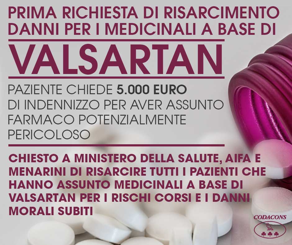 Il Codacons ha dunque chiesto con atto formale a Ministero della Salute, Aifa e Menarini Ind Farm Riun Srl di risarcire con 5.000 euro un utente residente in provincia di Matera, affetto da problemi cardiaci e ipertensione arteriosa e in terapia con farmaci a base di valsartan prodotti dall’azienda Menarini, per il danno morale subito e i pericoli corsi sul fronte della salute, preannunciando in caso di rifiuto l’avvio di una causa risarcitoria in tribunale.