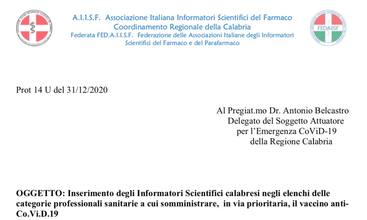 - Che gli Informatori Scientifici del Farmaco Calabresi (circa 1500 unità) siano al più presto sottoposti alla somministrazione del vaccino anti-CoViD19, alla stregua di tutti gli altri operatori sanitari calabresi. La sicurezza di questi Professionisti risulta di fondamentale importanza in quanto il loro posto di lavoro è esattamente il medesimo di quello di tutti gli altri operatori sanitari, ovvero cliniche, ospedali, ambulatori medici. D’altronde, é ormai ampiamente dimostrato, che non vi è modo alternativo altrettanto efficace, per veicolare a tutti i medici, le giuste informazioni riguardanti le innumerevoli novità scientifiche relative adesso anche ai nuovi vaccini ed anticorpi monoclonali studiati. Professionisti che troppo spesso, in questo periodo di pandemia, si vedono precluso inspiegabilmente l’accesso nelle strutture, nonostante hanno ricevuto più che adeguata formazione circa l’adozione di severi protocolli di sicurezza ed il corretto utilizzo dei dispositivi di protezione individuale, al termine della quale sono stati sottoposti a test di verifica. Al contrario, figure professionali così preparate, possono essere considerate utili non solo per il capillare lavoro di informazione che svolgono verso gli operatori sanitari, ma anche per una conseguente e naturale opera di informazione e controllo, nei confronti di figure non sanitarie che frequentano corridoi e sale d’attesa senza rispettare le norme del vivere civile comunitario , che soprattutto questo periodo, impone.