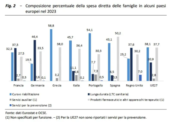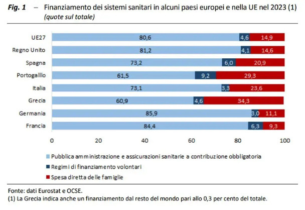Quello italiano, come quello di altri paesi europei, è un sistema sanitario ibrido: pubblico e privato. La questione è che la quota di privato aumenta, sia quella acquistata dal pubblico che quale pagata direttamente dalle famiglie, mentre il finanziamento pubblico diminuisce. Secondo l’Upb “quasi un terzo della spesa pubblica è destinato a servizi erogati da fornitori privati”. Tradotto significa che il Ssn acquista” servizi da soggetti privati. Ospedali, Rsa, laboratori e cooperative che erogano servizi ai cittadini e alle cittadine pagate dal pubblico.