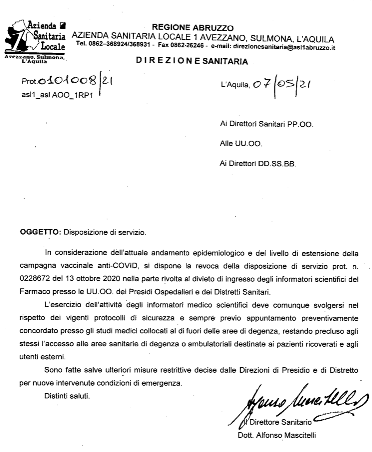 è stata REVOCATA la disposizione di servizio che impediva l’ingresso degli ISF presso le UU.OO. dei Presidi Ospedalieri e dei Distretti Sanitari de L’Aquila.