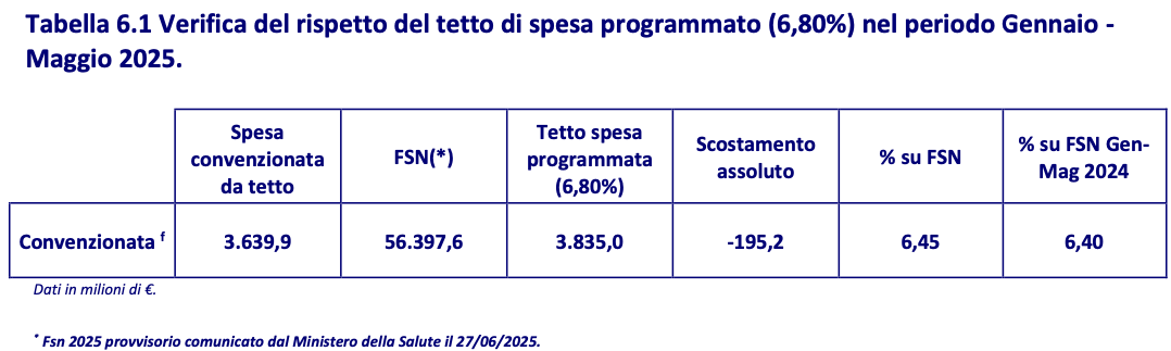 - · il tetto programmato della spesa farmaceutica convenzionata del 6,80%, calcolato sul FSN 2025 provvisorio, è pari a 3.835,0 mln di €;