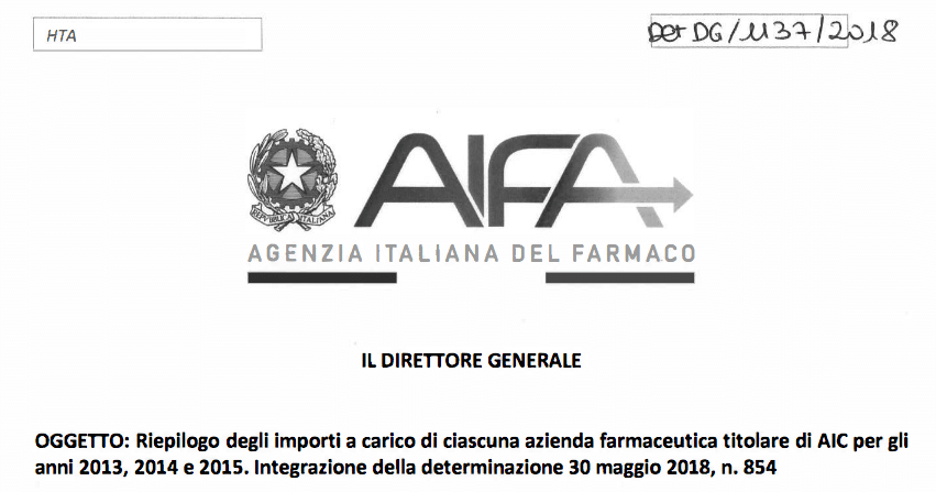 L’Agenzia Italiana del Farmaco rende disponibile la Determina n. 1137/2018 circa il riepilogo degli importi a carico di ciascuna azienda farmaceutica titolare di AIC per gli anni 2013, 2014 e 2015.