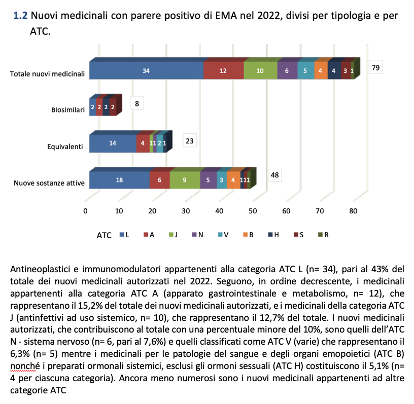 In Europa, nel corso del 2022, sono stati autorizzati 89 nuovi medicinali, di cui 48 contenenti nuove sostanze attive, 8 biosimilari, 23 equivalenti e 10 tra medicinali ibridi, sostanze attive note e farmaci autorizzati con la procedura del consenso informato.