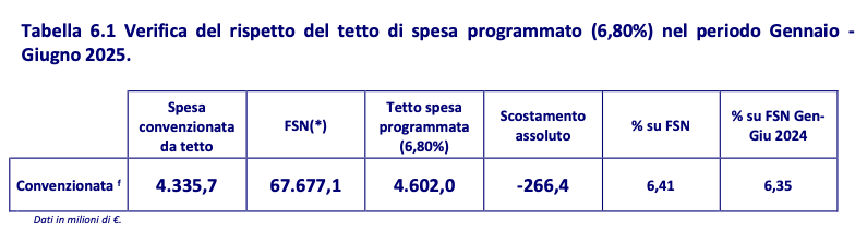 Per la verifica del tetto della spesa convenzionata, come disposto dalla Legge di stabilità 2017, la tabella 6.1 riporta il valore della spesa farmaceutica convenzionata al netto dei payback vigenti rispetto al tetto del 6,80% (4.602,0 mln di € calcolato sul FSN 2025 provvisorio), pari a 4.335,7 milioni di euro che incide sul FSN per il 6,41% generando un avanzo di 266,4 milioni di euro.