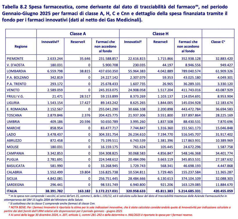 La tabella 8.2 riporta la spesa farmaceutica, al netto dei gas medicinali, come derivante dal dato della tracciabilità del farmaco (ossia la spesa non convenzionata), facendo non solo la distinzione per classi (A, H e C) ma anche per farmaci innovativi, per gli antibiotici “reserve” e per i farmaci che non accedono al fondo. Nella tabella è riportata la stima della spesa per le sole indicazioni innovative (piene e condizionate come riportato dalla Determina AIFA n. 966/2025 – GU Serie Generale n.160 del 12-07-2025), e la spesa per gli antibiotici “reserve”.
