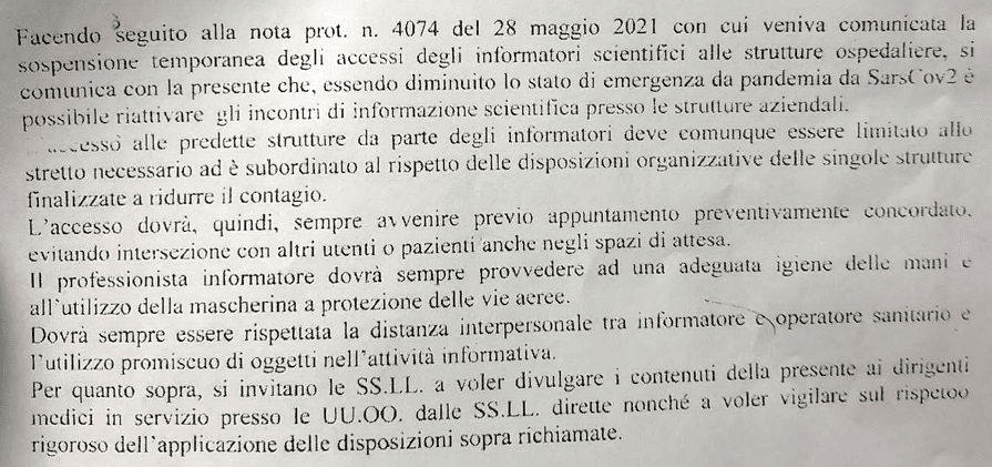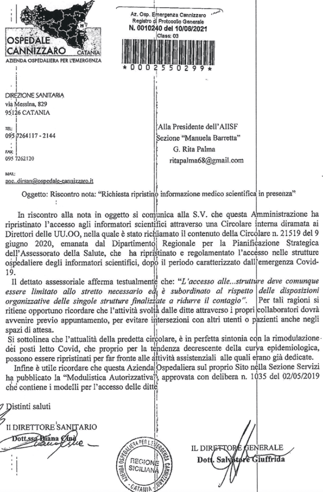 In una nota inviata alle Presidente della Sezione AIISF di Catania, federata Fedaiisf, la Direzione Sanitaria e la Direzione Generale dell’Ospedale Cannizzaro hanno comunicato che è stato ripristinato l’accesso degli Informatori Scientifici con una circolare inviata alle Direzioni di UU.OO.