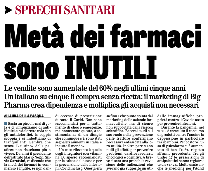 Su La Verità del 17 ottobre 2022 a pagina 10 si riporta un intervento/intravista del Prof. Garattini: “La spesa