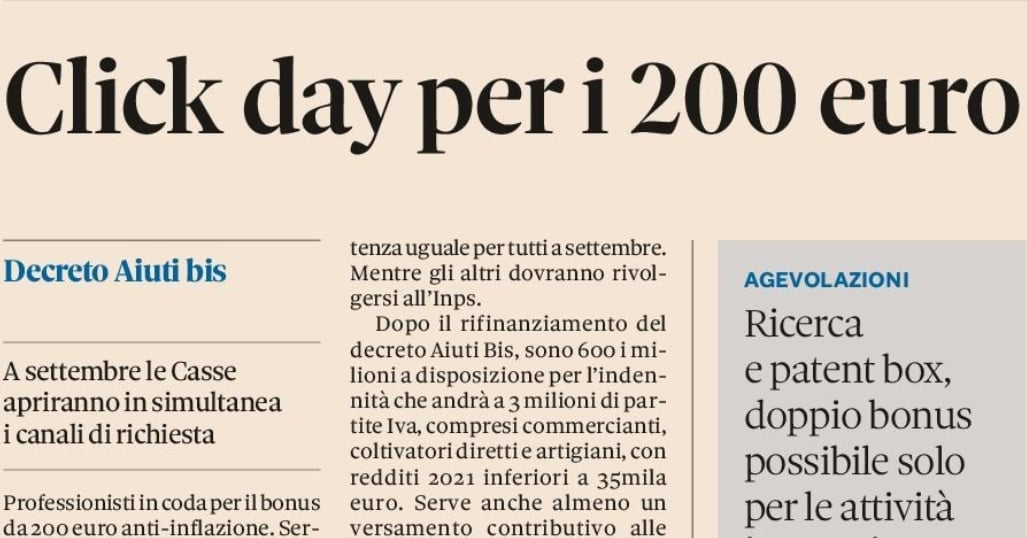 Notizie correlate: Il Sole 24Ore. Bonus 200 euro autonomi: ecco a che punto siamo. Il dubbio che le risorse non bastino per tutti