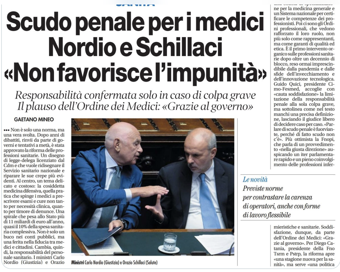 materia di professioni sanitarie e disposizioni relative alla responsabilità professionale degli esercenti le professioni sanitarie. Il provvedimento modifica la normativa attualmente vigente. Con l’approvazione da parte del Consiglio dei ministri, lo scudo penale per i medici, già previsto durante il periodo della pandemia di Covid e poi prorogato più volte, diventa strutturale.