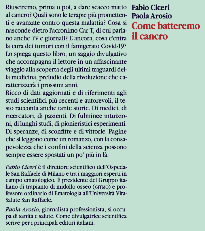 Dal presente si passa così a guardare al futuro, più o meno prossimo. Le ricerche in corso in quest’ambito in tutto il mondo sono tante e promettenti. Di recente risultati incoraggianti sono stati ottenuti per quanto riguarda leucemia linfatica cronica, leucemia mieloide acuta, linfoma follicolare, linfoma mantellare. Ma anche per quanto concerne alcuni tumori solidi, in particolare glioblastoma, mesotelioma, carcinoma del fegato, del pancreas, del colon-retto, cancro della prostata e della tiroide, sarcoma, neuroblastoma. Il libro racconta tutte le sperimentazioni e i loro esiti, ricostruendo una panoramica a 360 gradi dei successi ottenuti e dei problemi da risolvere. Infine, viene descritto il possibile impiego delle Car T contro il rigetto nei pazienti sottoposti a trapianto, le malattie autoimmuni, l’Hiv. E si va perfino oltre i confini dell’immunità, raccontando le ipotetiche applicazioni nella fibrosi cardiaca e nelle patologie derivanti dall’invecchiamento, come aterosclerosi, osteoartrite, fibrosi epatica e polmonare. Si tratta di una strada nuova, affascinante, sulla quale si stanno muovendo i primi passi. Ora non resta che proseguire con fiducia nel percorso intrapreso, con la consapevolezza che i confini della scienza possono sempre essere spostati un po’ più in là.