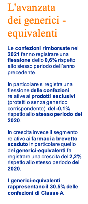 In crescita invece il segmento relativo ai farmaci a brevetto scaduto in particolare quello dei generici-equivalenti che fa registrare una crescita del 2,2% rispetto allo stesso periodo del 2020.