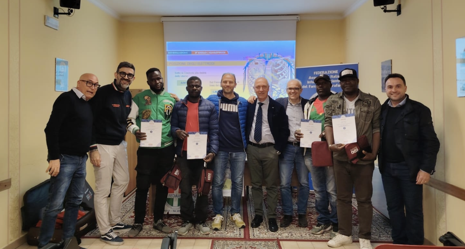 “Il corso si è tenuto presso la Caritas di San Severo, diretta da don Andrea Pupilla che ha reso possibile l’individuazione di alcuni ragazzi volenterosi del ‘ghetto’ a cui è stato rilasciato il brevetto BLS-D”, ha dichiarato al quotidiano “l’Attacco”, il presidente provinciale AllSF, Cosimo Grossano. “Quest’iniziativa, sempre nel progetto ‘Battiti per la vita’, è nata dopo la morte di Antoine deceduto nella baraccopoli del ‘Ghetto’ alcune settimane fa – hanno riferito i promotori, per il tramite di Celeste e laffaldano -.