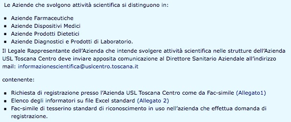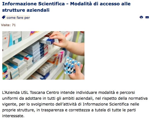 https://www.uslcentro.toscana.it/index.php/15-come-fare-per/18647-informazione-scientifica-modalita-di-accesso-alle-strutture-aziendali (accedendo su Homepage da Come fare per / Tutti i servizi dalla A alla Z > pag 2> Informazione Scientifica – Modalità di accesso alle strutture aziendali )