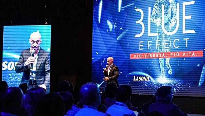 Per comunicare questi concetti il centro congressi del Milan Marriott Hotel, l’albergo in cui i partecipanti hanno anche soggiornato, è stato personalizzato con una scenografia di luci blu (il colore del marchio Lasonil) che ha fatto da cornice agli speech con cui manager hanno interpretato in chiave non solo aziendale l’importanza del concetto di libertà.