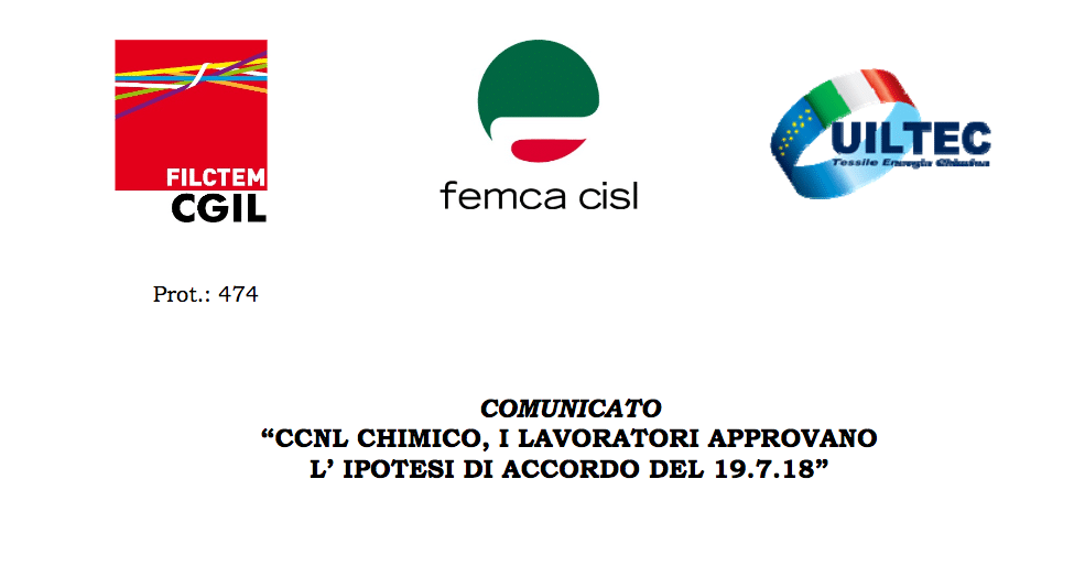 Filctem Cgil, Femca Cisl, Uiltec Uil esprimono soddisfazione per l’esito del percorso democratico e di partecipazione che ha portato così al rinnovo del contratto per 178.000 lavoratori e, nei prossimi giorni scioglieranno la riserva alle Federazioni Datoriali di Federchimica e Farmindustria per la firma definitiva dell’accordo.