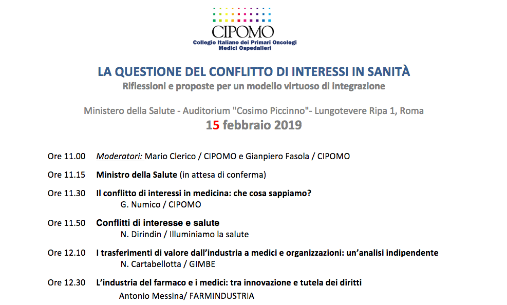 Si è appena concluso l’incontro dal titolo “La questione del conflitto di interessi in sanità: riflessioni e proposte per un modello virtuoso di integrazione” organizzato e curato da CIPOMO (Collegio Italiano dei Primari Oncologi Medici Ospedalieri) con il Patrocinio del Ministero della Salute il quale ha messo a disposizione l’Auditorium Piccinno.