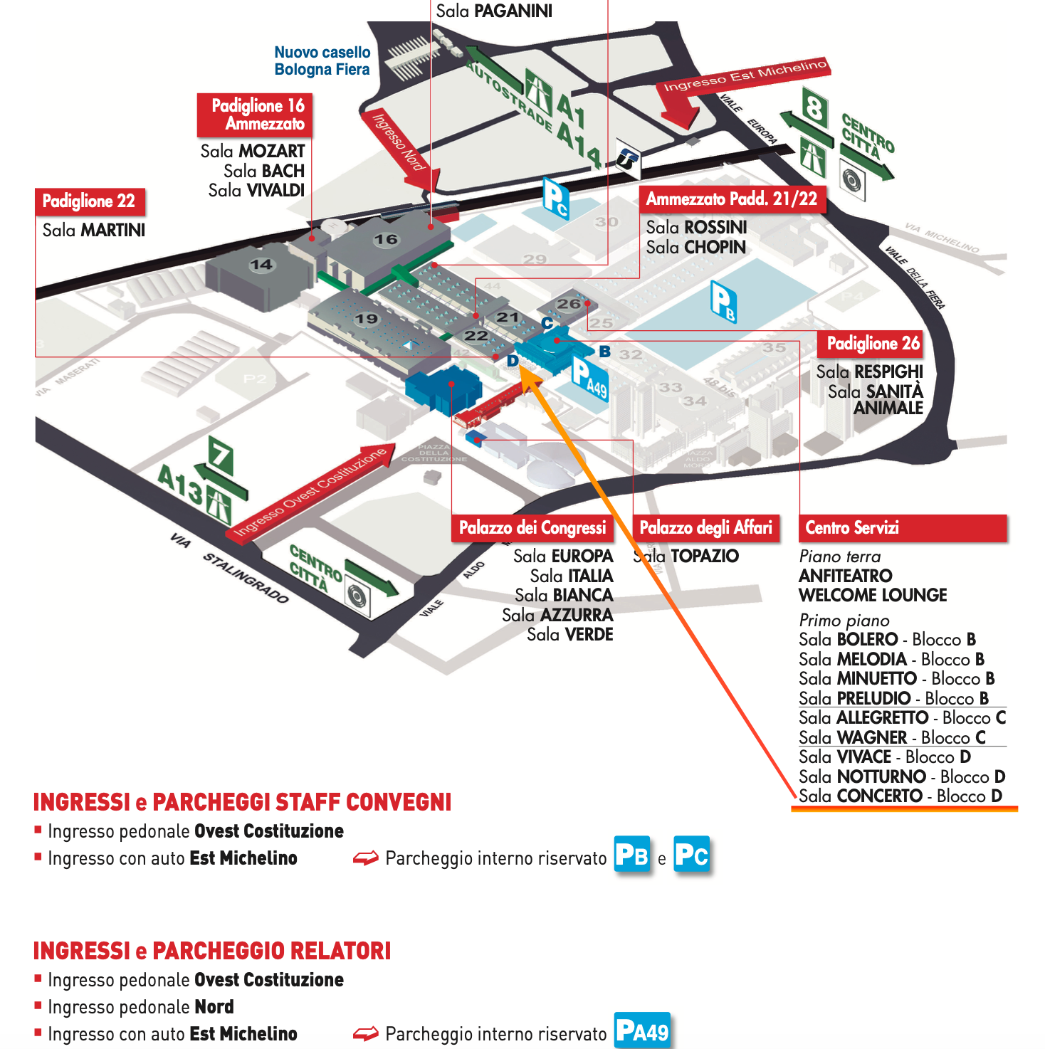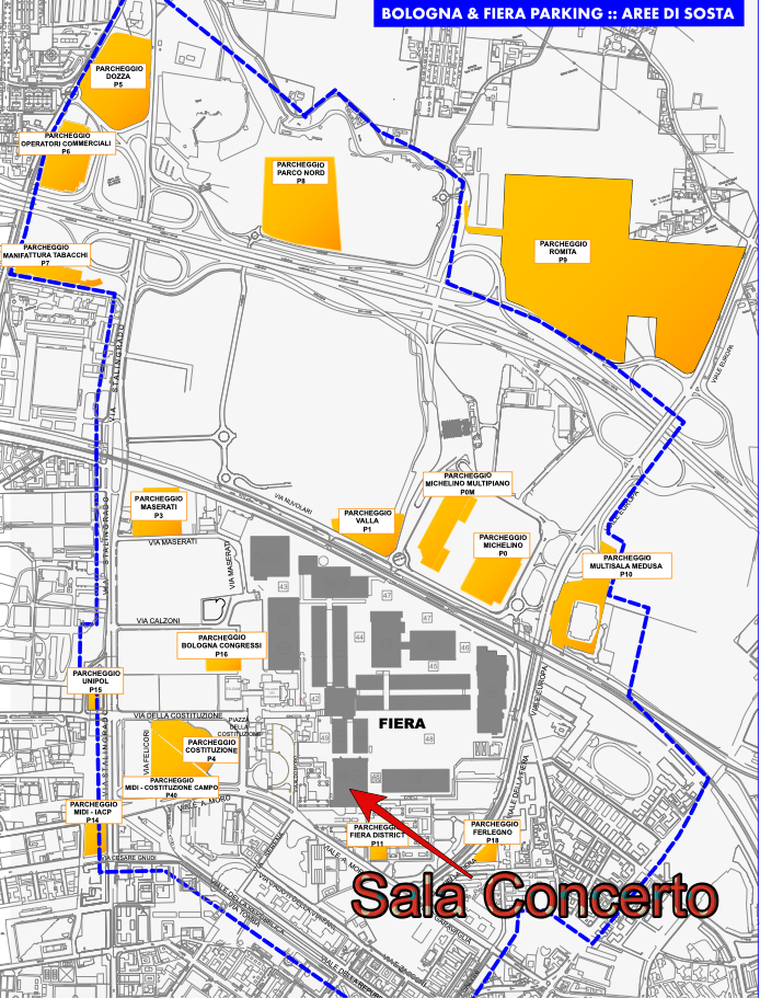 1) P0 Michelino, via Michelino: 4 piani coperti e 1 piano scoperto, 5500 posti auto, presidiato. Aperto dalle 7 alle 19,30 per manifestazioni fieristiche,.