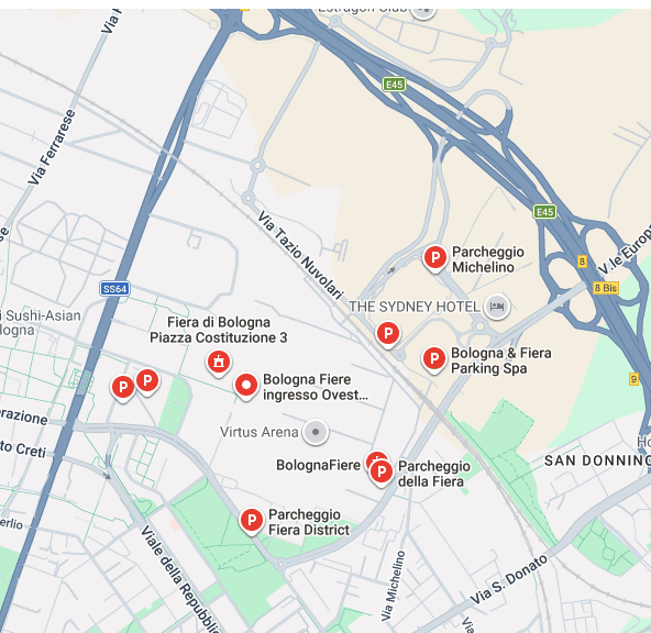 Nella zona del Quartiere Fieristico di Bologna ci sono diverse aree sosta, gestite  da Bologna & Fiera Parking in convenzione con il Comune. Si trovano nelle immediate vicinanze degli ingressi della fiera.