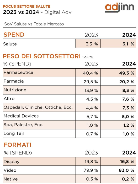 Secondo i dati di Adjinn, nel 2024 la share of voice del comparto salute è infatti pari al 3,1% del totale mercato adv, in linea con il 2023 (3,3%).