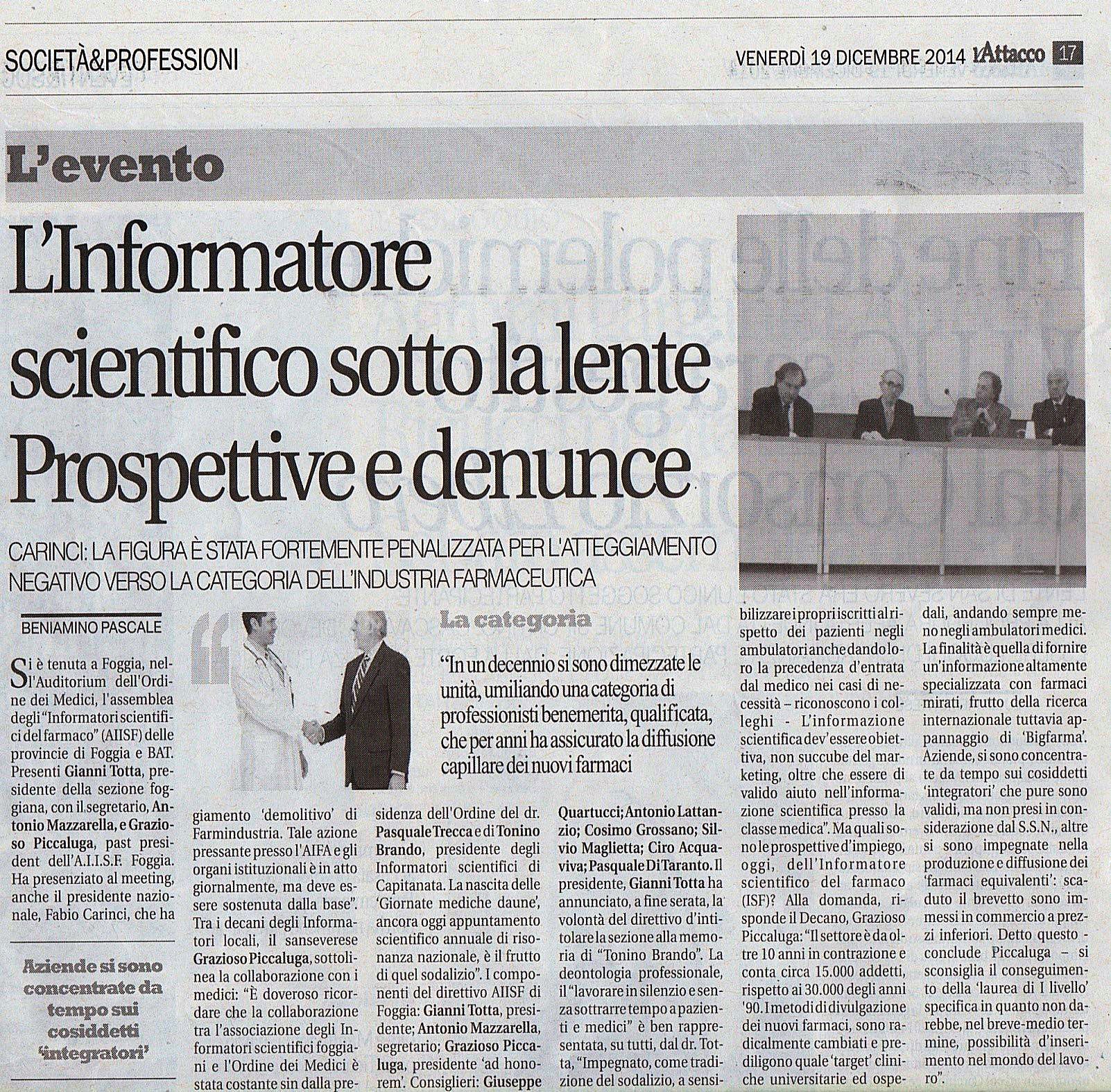 Si è tenuta a Foggia nell’Auditorium dell’Ordine dei Medici, l’assemblea degli “Informatori Scientifici del Farmaco” (AIISF, federata Fedaiisf) delle province di Foggia e BAT. Presenti Gianni Totta, presidente della sezione foggiana, con il segretario, Antonio Mazzarella, And Grazioso Piccaluga, past president dell’A.I.I.S.F. di Foggia. Ha presenziato al meeting anche il presidente federale nazionale Fedaiisf, Fabio Carinci, che ha richiamato l’assemblea sulla drammatica situazione degli informatori scientifici italiani per i quali una legge dello Stato ha stabilito dal ’93, che “Per esercitare la professione bisogna essere in possesso di laurea in Farmacia o CTF, Medicina, Biologia, Medicina Veterinaria, laurea di I° livello in Informazione Scientifica, Chimica ad indirizzo “Organico”, Scienze Naturali.