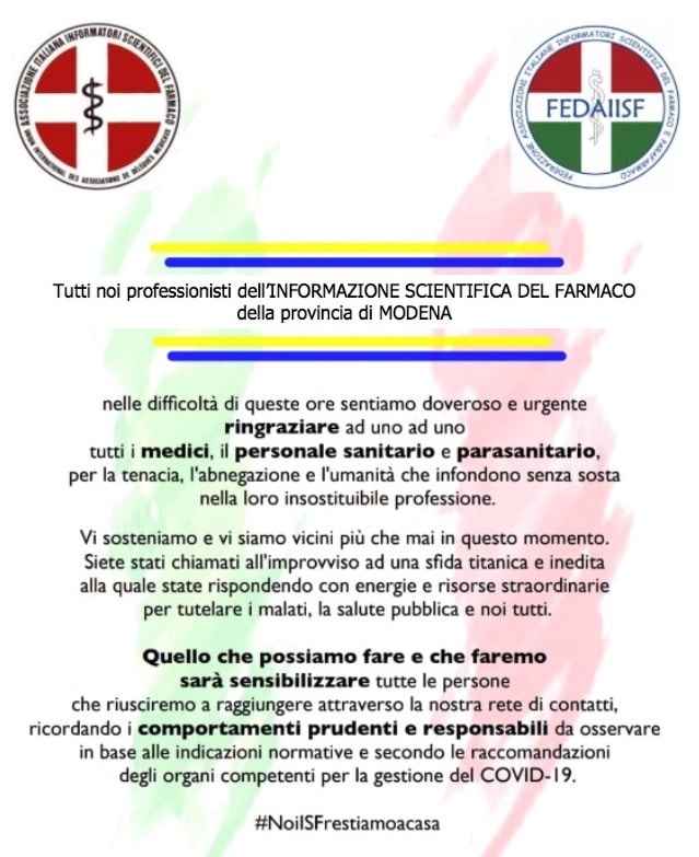Nata da una idea della dott.ssa Valentina Solfrini della regione Emilia Romagna di coinvolgere Fedaiisf in opere di volontariato gratuite da svolgere in ambito sanitario in questo particolare momento, la Sezione di Modena ha dato da subito la sua disponibilità che è stata prontamente colta dal Direttore del distretto di Modena dott. Andrea Spanò impiegando i colleghi ISF volontari disponibili presso il Dipartimento di Sanità Pubblica in opere di volontariato gratuite per attività connesse all’emergenza Coronavirus .