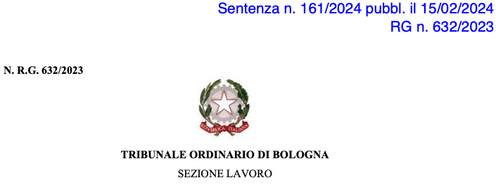 Anche Gualandi, come semplice lavoratore, al di là dall’essere sindacalista, ha impugnato il licenziamento per violazione dell’art. 18 (licenziamento senza giusta causa o giustificato motivo) dello Statuto dei Lavoratori.  Ora anche questa azione giudiziaria è andata a sentenza e pubblicata il 15 febbraio scorso (Tribunale Ordinario di Bologna – Sez. LavoroSentenza 161/2024 pubbl. 15.02.2024 RG n.632/2023)