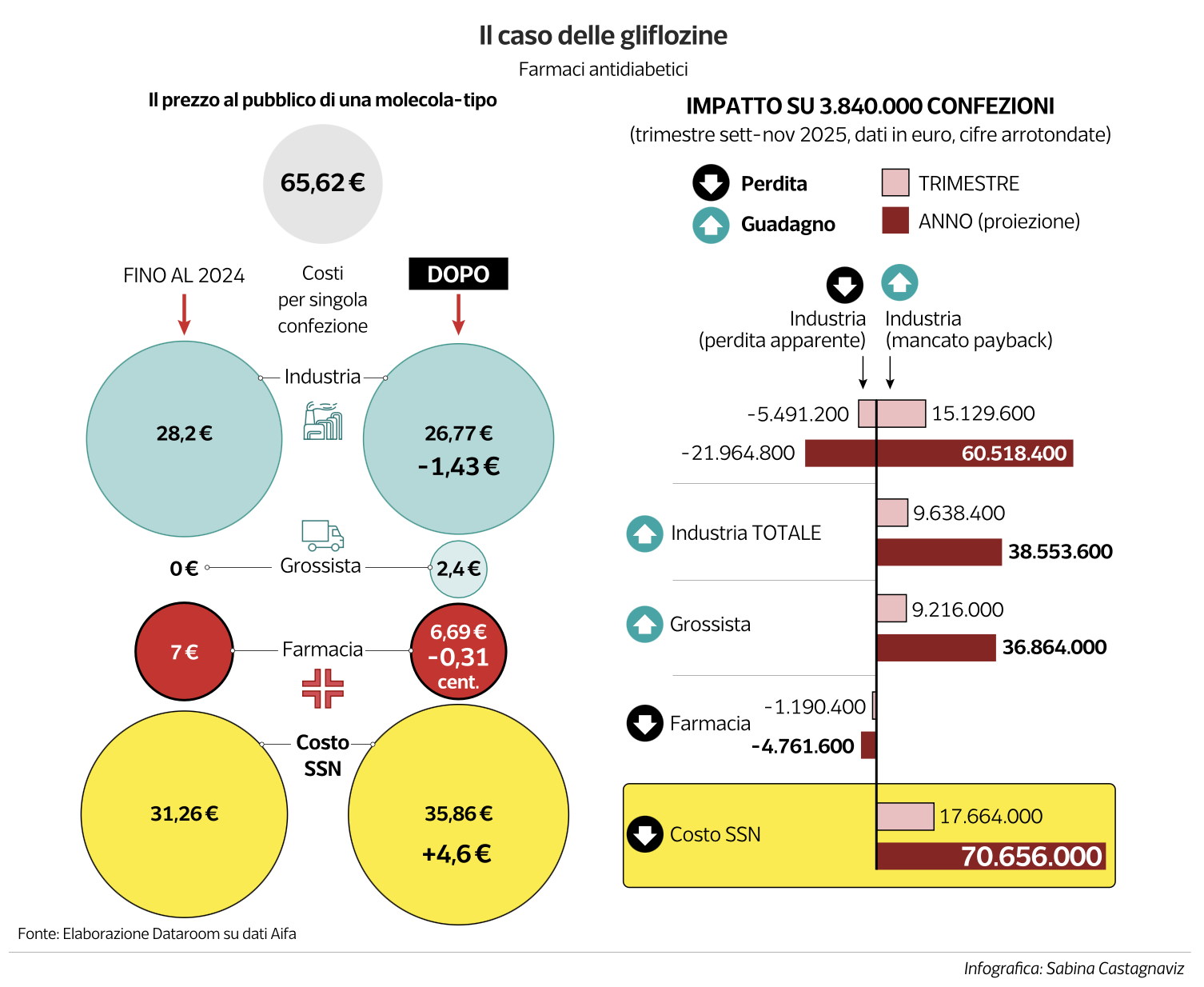 Secondo i calcoli riportati da Dataroom, nonostante due sconti negoziati da Aifa (28,56% e un ulteriore 7%), il guadagno annuo aggiuntivo per l’industria sarebbe di 38,55 milioni di euro, mentre la perdita complessiva per lo Stato, solo per le gliflozine, sarebbe stimata in 70,6 milioni di euro all’anno.