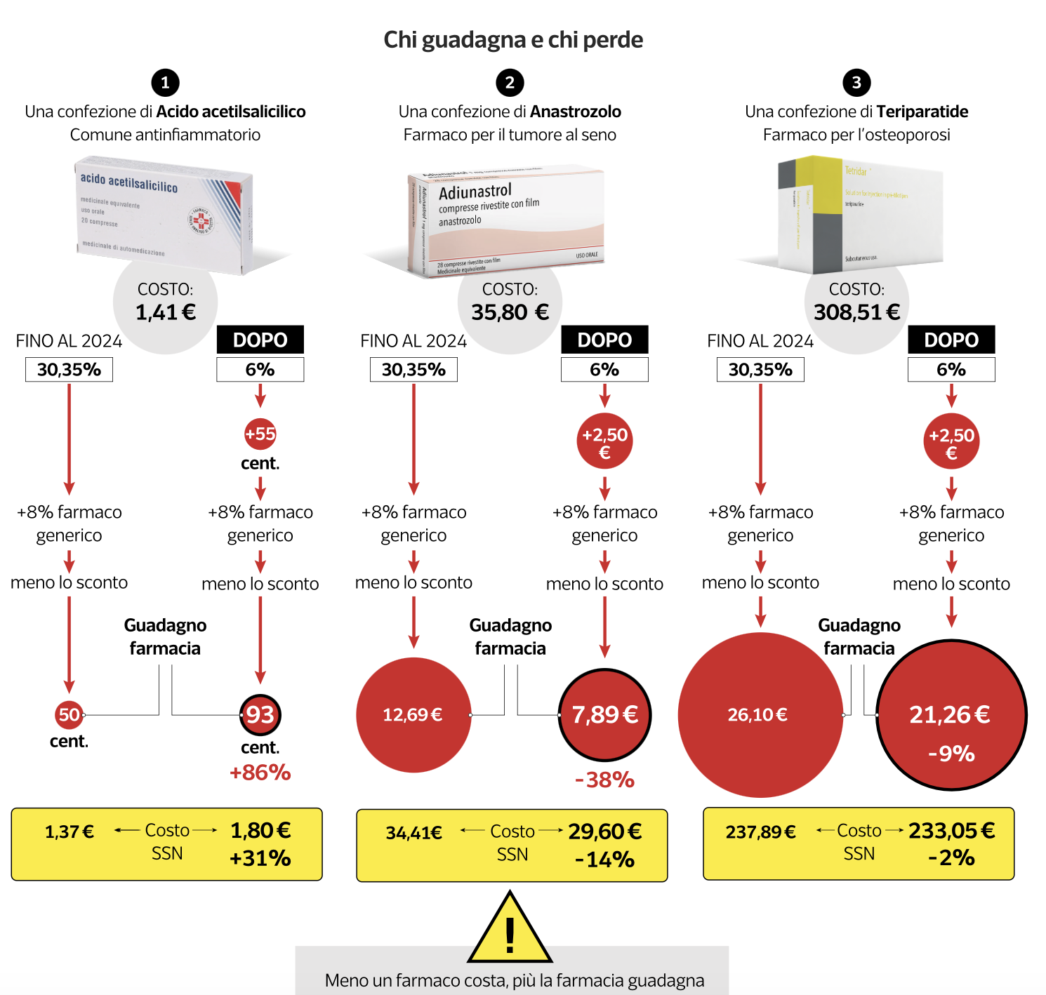 Dataroom analizza tre casi. Primo, per una confezione di acido acetilsalicilico (ASA), un comune antinfiammatorio, da 1,41 euro, il margine della farmacia passa da 50 centesimi a 93 centesimi: un aumento dell’86%, con un incremento del costo per lo Stato del 31%. (N.d.R.: evidentemente si riferisce a ASA 100 mg generico usato come antiaggregante e non come antinfiammatorio)