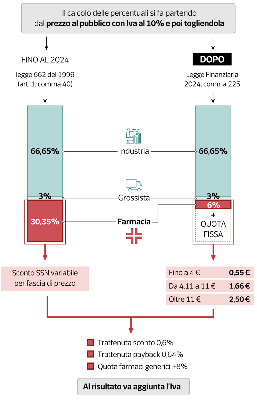 Fino al 2024 la farmacia riceveva il 30,35% del prezzo al pubblico. Con il nuovo sistema il margine cambia radicalmente a seconda del prezzo della confezione.