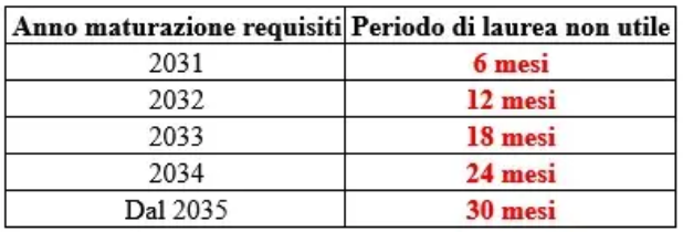 La riduzione è progressiva: 6 mesi nel 2031, 12 mesi nel 2032, 18 mesi nel 2033, fino ad arrivare a 30 mesi esclusi dal 2035. Questo significa che quei mesi dovranno essere recuperati con ulteriore lavoro effettivo.