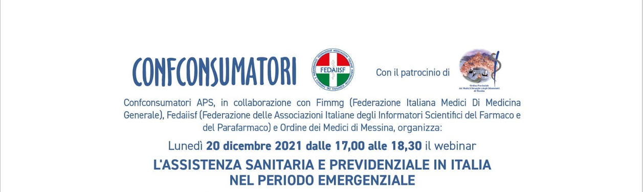 Nell’ambito del progetto Covid Campania, Confconsumatori, in collaborazione con Fimmg (Federazione Italiana Medici Di Medicina Generale), Fedaiisf (Federazione delle Associazioni Italiane degli Informatori Scientifici del Farmaco e del Parafarmaco) e Ordine dei Medici di Messina, organizza per lunedì 20 dicembre alle 17,00 un webinar su piattaforma ZOOM dal titolo “L’assistenza sanitaria e previdenziale in Italia nel periodo emergenziale”. L’evento ha come obiettivo di creare i presupposti per una riflessione a più voci tra Istituzioni, esperti, operatori del settore e rappresentanti dei consumatori sui diritti del cittadino durante la pandemia. Le criticità, le prospettive e, soprattutto, le figure chiave che svolgono un ruolo strategico, sia nel garantire un’adeguata assistenza, sia nel contrastare la diffusione del virus Covid-19 e le relative ricadute che incidono sulle famiglie italiane.