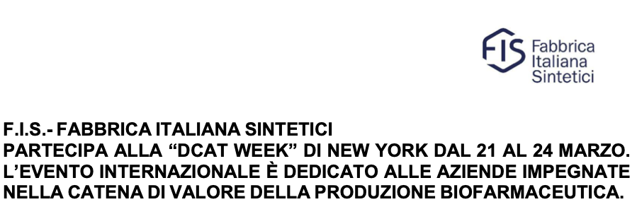 Montecchio Maggiore (VI), 16 marzo 2022 – F.I.S. – Fabbrica Italiana Sintetici S.p.A., leader in Italia e tra i principali operatori in Europa nella produzione di principi attivi per l’industria farmaceutica, partecipa alla DCAT Week, uno dei più importanti eventi annuali internazionali dedicati alle aziende impegnate nella catena di valore della produzione biofarmaceutica promosso da DCAT (Drug, Chemical & Associated Technologies Association).