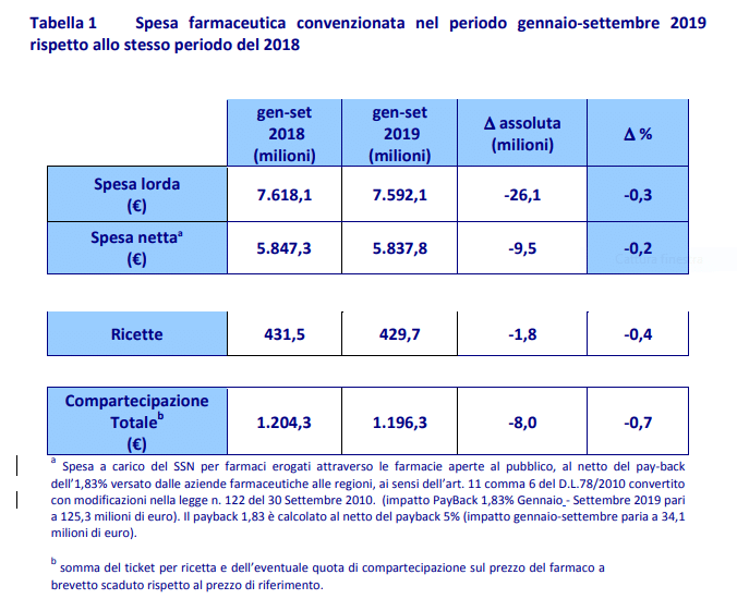 Ammonta a quasi 6 miliardi la spesa farmaceutica convenzionata netta a carico del Ssn nel periodo gennaio-settembre 2019: calcolata al netto degli sconti, della compartecipazione totale (ticket regionali e compartecipazione al prezzo di riferimento) e del pay-back dell’1,83% versato alle Regioni dalle aziende
