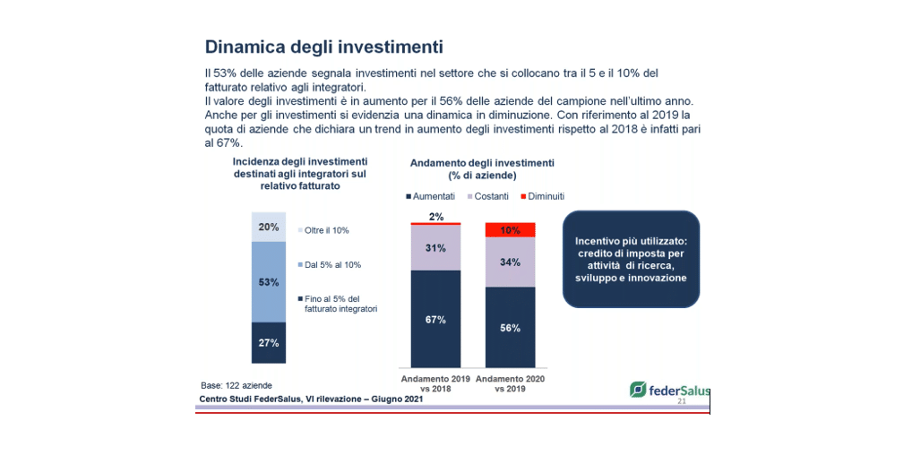 L’indagine condotta da Intesa Sanpaolo, su un campione di 148 imprese del settore individuate da FederSalus e con più del 40% del fatturato riconducibile a integratori alimentari, conferma che dietro ai risultati del comparto vi è un nucleo di imprese altamente competitive. Si tratta di imprese di gran lunga più dinamiche rispetto al resto dell’economia italiana e con livelli di marginalità di eccellenza. Questi risultati si spiegano con l’elevata propensione a investire in leve immateriali (innovazione in primis) e a valorizzare il capitale umano, oltreché con la presenza di filiere di fornitura ben radicate nel territorio, che è stato possibile individuare attraverso un’analisi originale dei pagamenti effettuati dalle imprese del settore