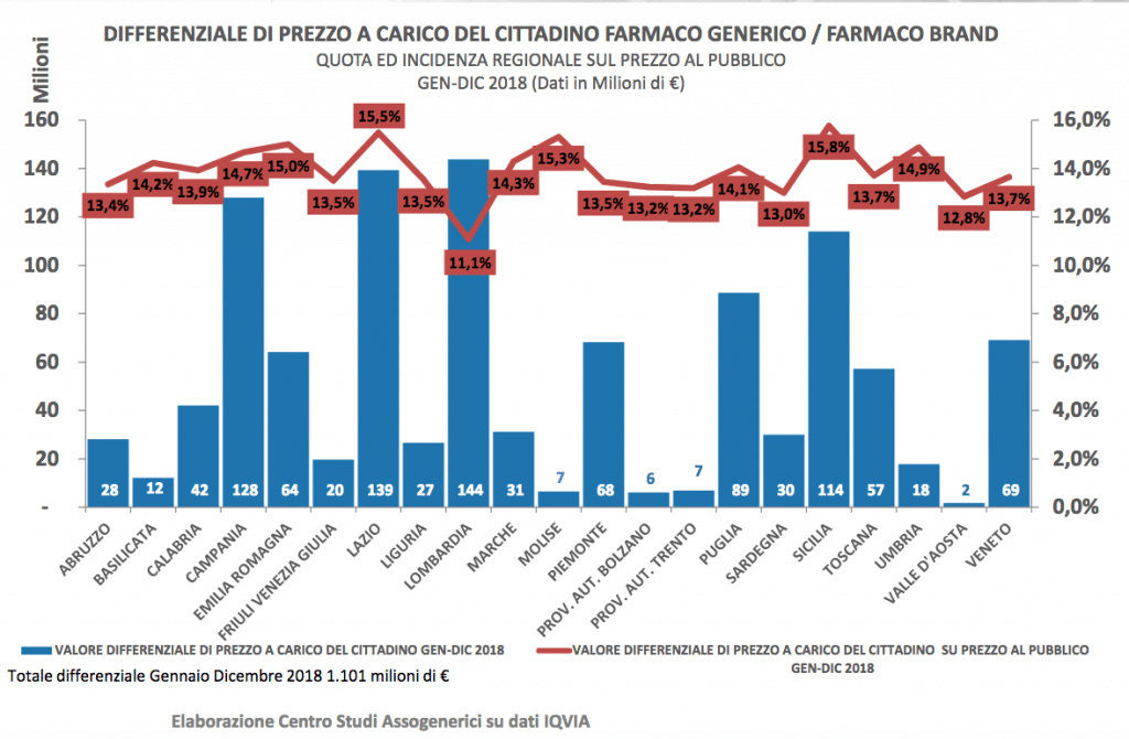 Ammonta infine a 1.101 milioni di euro la quota versata come differenziale di prezzo dai cittadini per ritirare il brand al posto dell’equivalente: l’incidenza maggiore a livello regionale e peraltro in crescita sul 2017 si registra in Sicilia (15,8% per complessivi 114 mln) e nel Lazio (15,5% pari a 139 milioni di euro). L’incidenza più bassa si registra invece ancora in Lombardia, dove il differenziale versato di tasca propria dai cittadini quota l’11,1% della spesa regionale SSN nel canale retail, per un totale di 144 milioni di euro.
