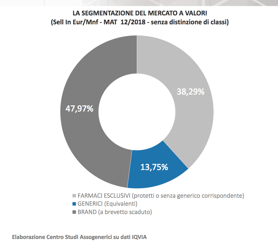 Nel canale farmacia (tutte le classi) la segmentazione del mercato dei soli prodotti off patent vede ancora una netta predominanza dei brand a brevetto scaduto che assorbono il 70% a confezioni e il 78% a valori, contro il 30% a confezioni e il 22% a valori degli equivalenti.