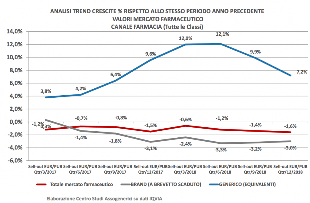 L’analisi degli andamenti nel canale farmacia evidenzia una performance positiva – anche se meno brillante rispetto al 2017 – dei prodotti equivalenti (tutte le classi), con l’ultimo trimestre dell’anno che chiude con una crescita dello 0,6% a unità e del 7,2% a valori, a fronte di un perdurante arretramento sia del mercato farmaceutico complessivo (-1,1% a unità e -1,6% a valori) sia del mercato dei branded a brevetto scaduto (-1,6% a unità e -3% a valori).