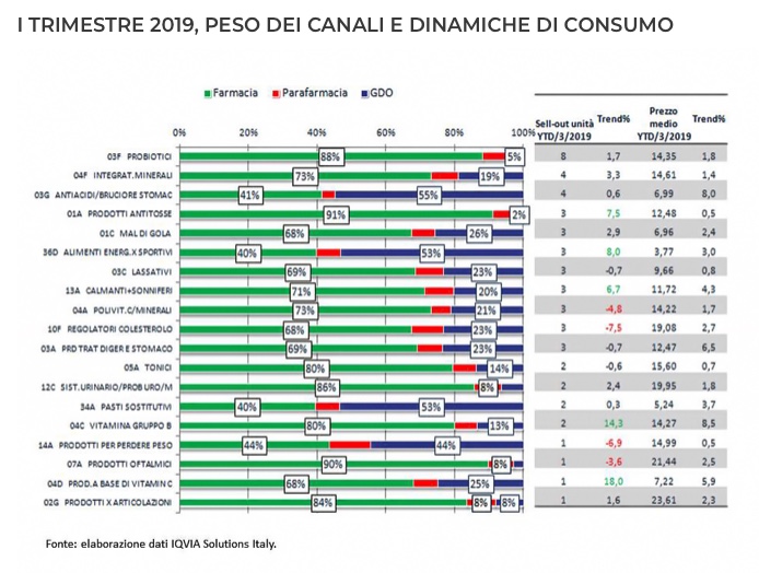Nel 2018, secondo dati IQVIA per FederSalus, sono state 26 milioni le prescrizioni mediche di integratori alimentari; il 95% del mercato degli integratori si sviluppa in farmacia (86%) e parafarmacia (9%); il restante 5% nella grande distribuzione organizzata (GDO).