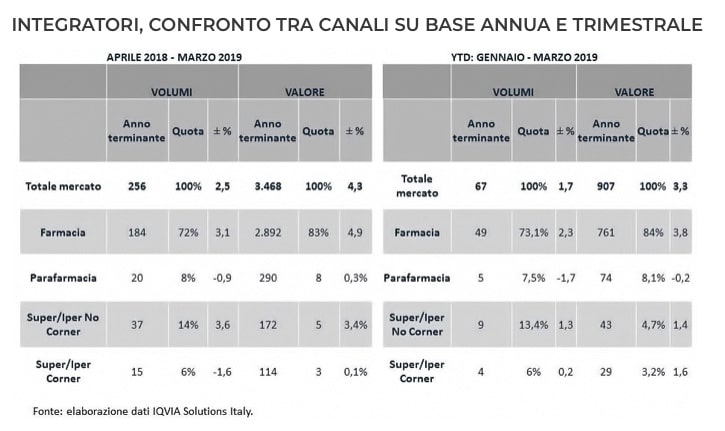 Nel 2018, secondo dati IQVIA per FederSalus, sono state 26 milioni le prescrizioni mediche di integratori alimentari; il 95% del mercato degli integratori si sviluppa in farmacia (86%) e parafarmacia (9%); il restante 5% nella grande distribuzione organizzata (GDO).