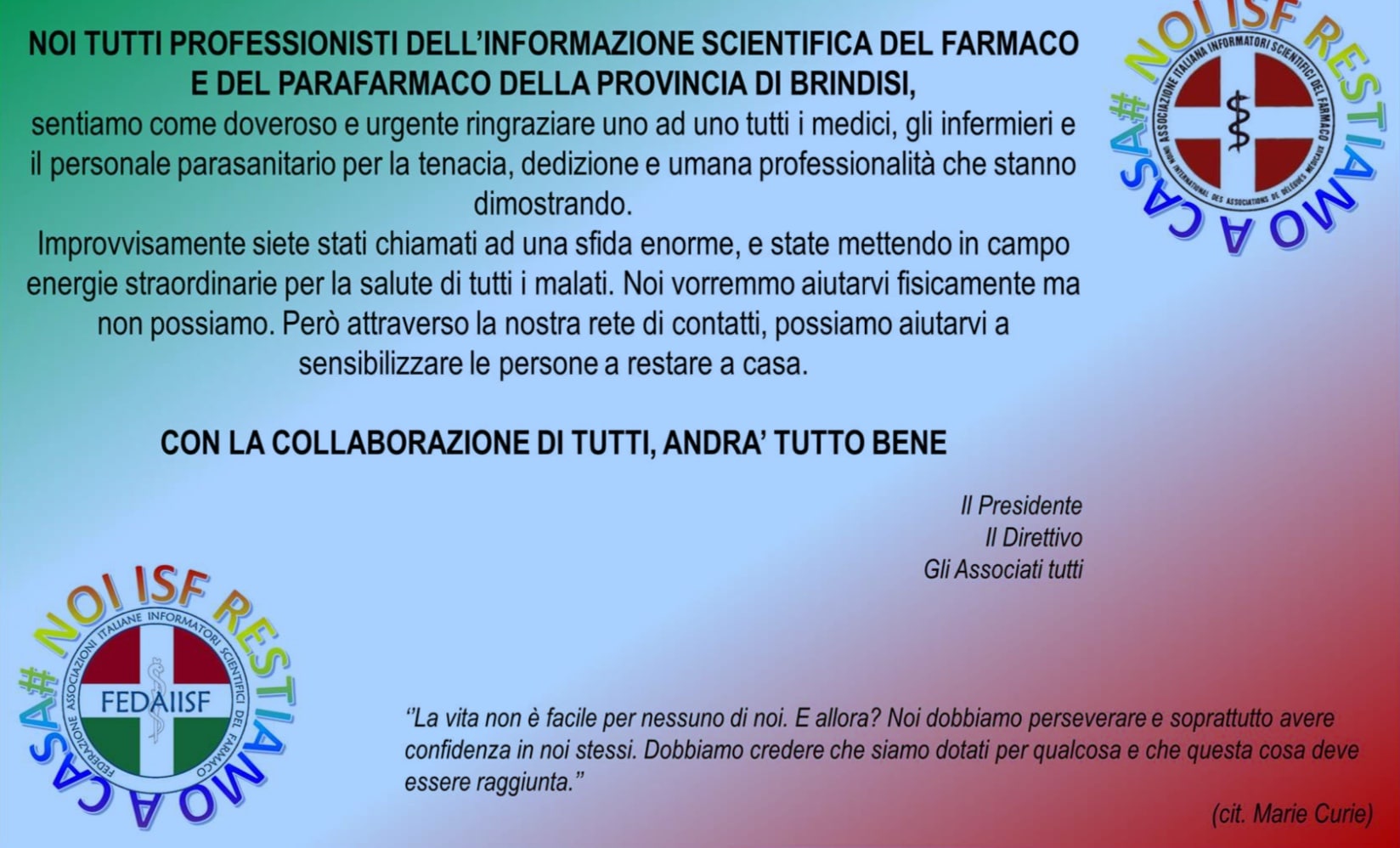 The scientific informants of the drug and parapharmaceutical of Brindisi have made a donation of 2880 euros to the ASL of Brindisi for the Covid emergency. Both members and non-members of Fedaiisf participated in the donation.