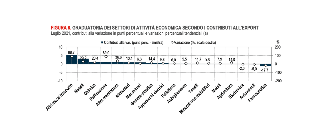 A luglio 2021, tutti i settori registrano ampi aumenti tendenziali delle esportazioni a eccezione di articoli farmaceutici, chimico-medicinali e botanici (-17,7%), autoveicoli (-5,0%) e computer, apparecchi elettronici e ottici (-2,0%).