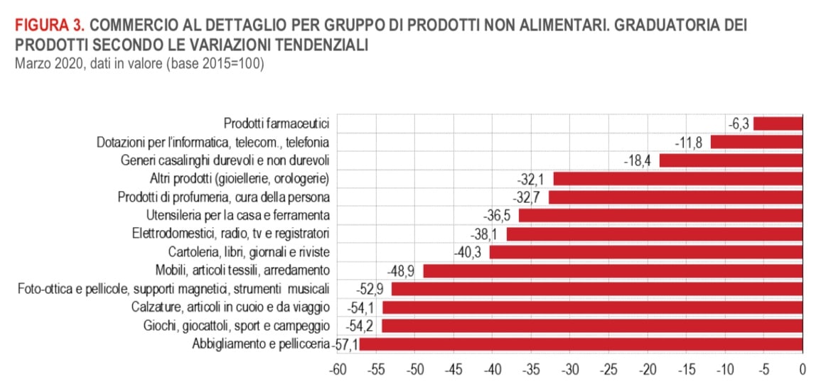 Per quanto riguarda i beni non alimentari, si registrano variazioni tendenziali negative per tutti i gruppi di prodotti. Le diminuzioni maggiori riguardano abbigliamento e pellicceria (-57,1%), giochi, giocattoli, sport e campeggio (-54,2%) e calzature, articoli in cuoio e da viaggio (-54,1%), mentre il calo minore si registra per i prodotti farmaceutici (-6,3%).