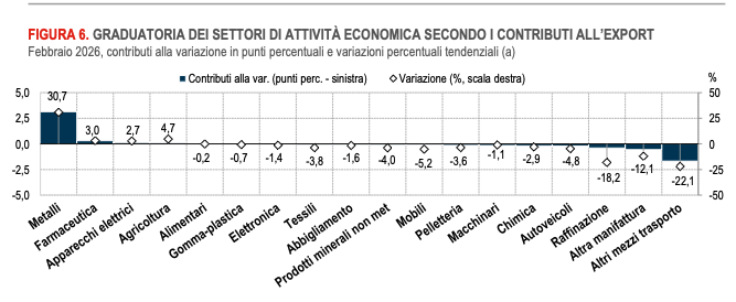 Nei primi due mesi del 2026, l’export registra una flessione tendenziale del 2,2%, cui contribuiscono soprattutto le minori vendite di mezzi di trasporto, esclusi autoveicoli (-16,3%), coke e prodotti petroliferi raffinati (-29,1%) e macchinari e apparecchi n.c.a. (-4,1%). L’apporto positivo maggiore deriva, invece, dall’aumento delle esportazioni di metalli di base e prodotti in metallo, esclusi macchine e impianti (+24,2%).