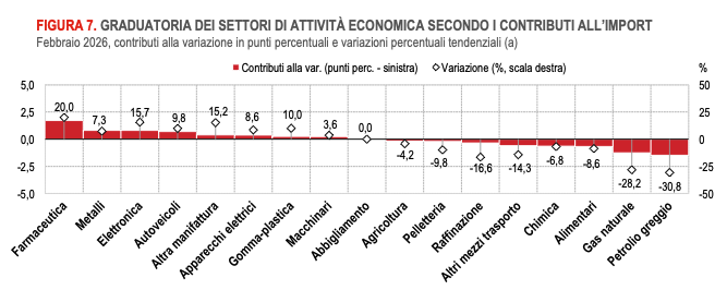 Il saldo commerciale a febbraio 2026 è pari a +4.944 milioni di euro (era +4.444 milioni nello stesso mese del 2025). Il deficit energetico (-3.466 milioni) è inferiore rispetto a un anno prima (-5.000 milioni). L’avanzo nell’interscambio di prodotti non energetici scende da +9.444 milioni di febbraio 2025 a +8.409 milioni di febbraio 2026.