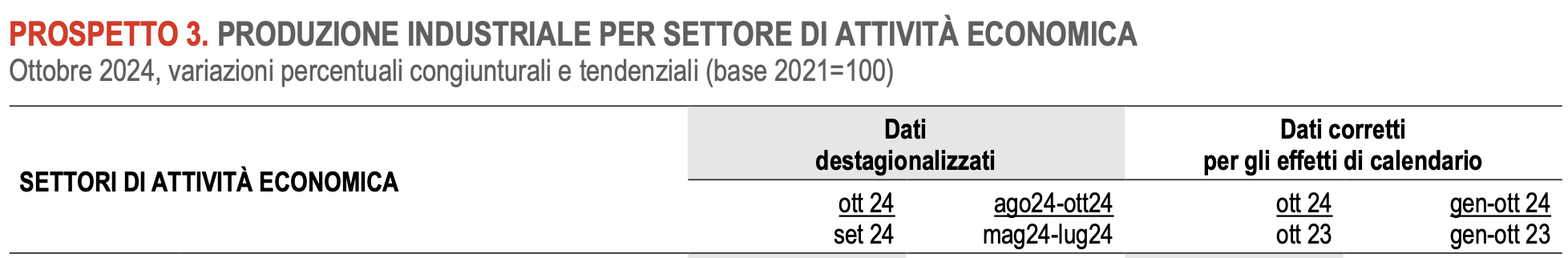 A ottobre 2024 si stima che l’indice destagionalizzato della produzione industriale rimanga invariato rispetto a settembre. Nella media del trimestre agosto-ottobre il livello della produzione diminuisce dello 0,7% rispetto ai tre mesi precedenti.