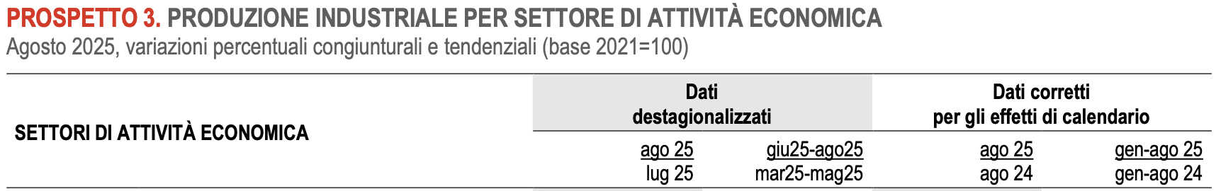 Corretto per gli effetti di calendario, ad agosto 2025 l’indice generale diminuisce in termini tendenziali del 2,7% (i giorni lavorativi di calendario sono stati 20 contro i 21 di agosto 2024). Crescono i beni strumentali (+0,7%) e i beni intermedi (+0,2%); diminuiscono, invece, i beni di consumo (-2,3%) e in misura più marcata l’energia (-8,6%).